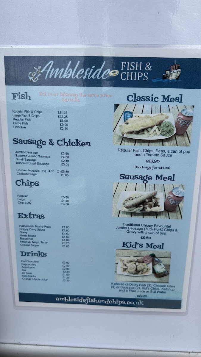 Welcome to Ambleside Fish & Chips, a delightful spot nestled at Waterhead, Ambleside, offering a true taste of the Lake District. The menu presents a tempting array of classic British fare, with highlights including Regular and Large Fish & Chips, perfectly cooked in clean oil with a light, crispy batter. The portion sizes are generous, ensuring satisfaction with every bite.